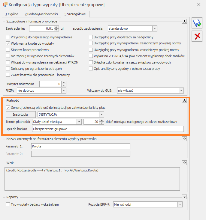 Z poziomu konfiguracji typu wypłaty na zakładce [Szczegółowe] dodano parametry związane z generowaniem płatności. W tej sekcji dostępne są następujące opcje: